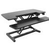 Robust height adjustable workstation with easy manual height adjustment via a fold away handle.